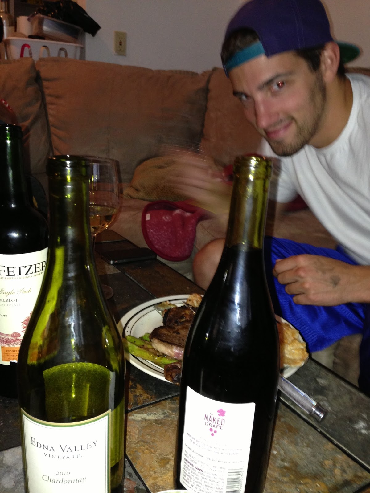 My friends really enjoyed this meal at home with these three wines and definitely decided that the Naked Grape Pinot Noir was the best of the bunch. We also decided that the Edna Valley Chardonnay was the worst. In the above picture, my friend is eating fish, asparagus, and steak with this eclectic variety of wines. I enjoyed the meal and definitely realized that a really good wine can enhance any food experience for the better.